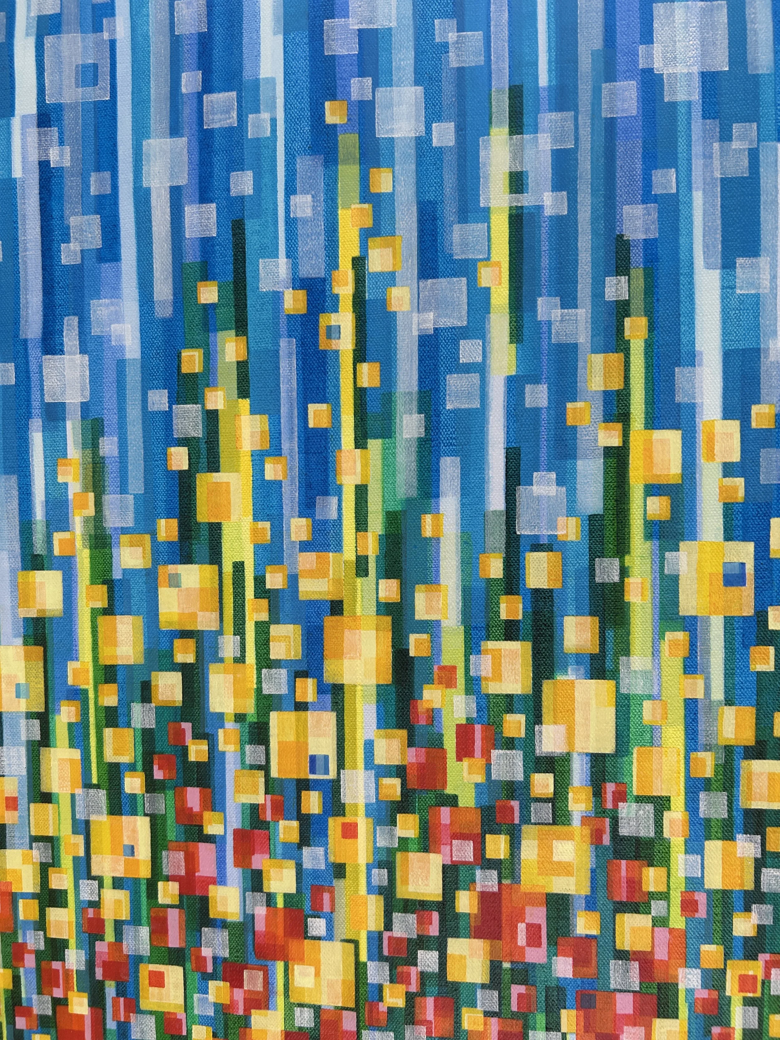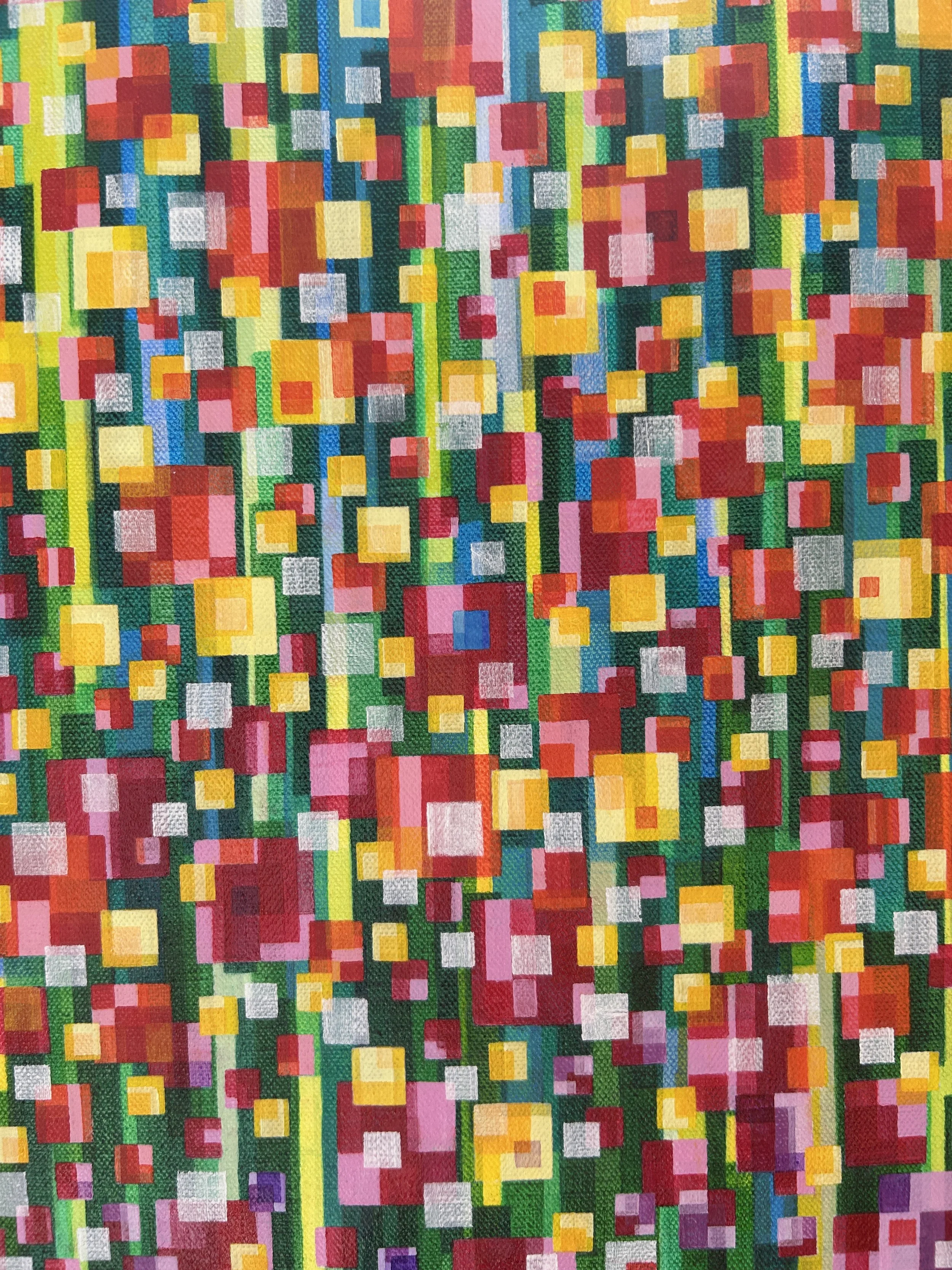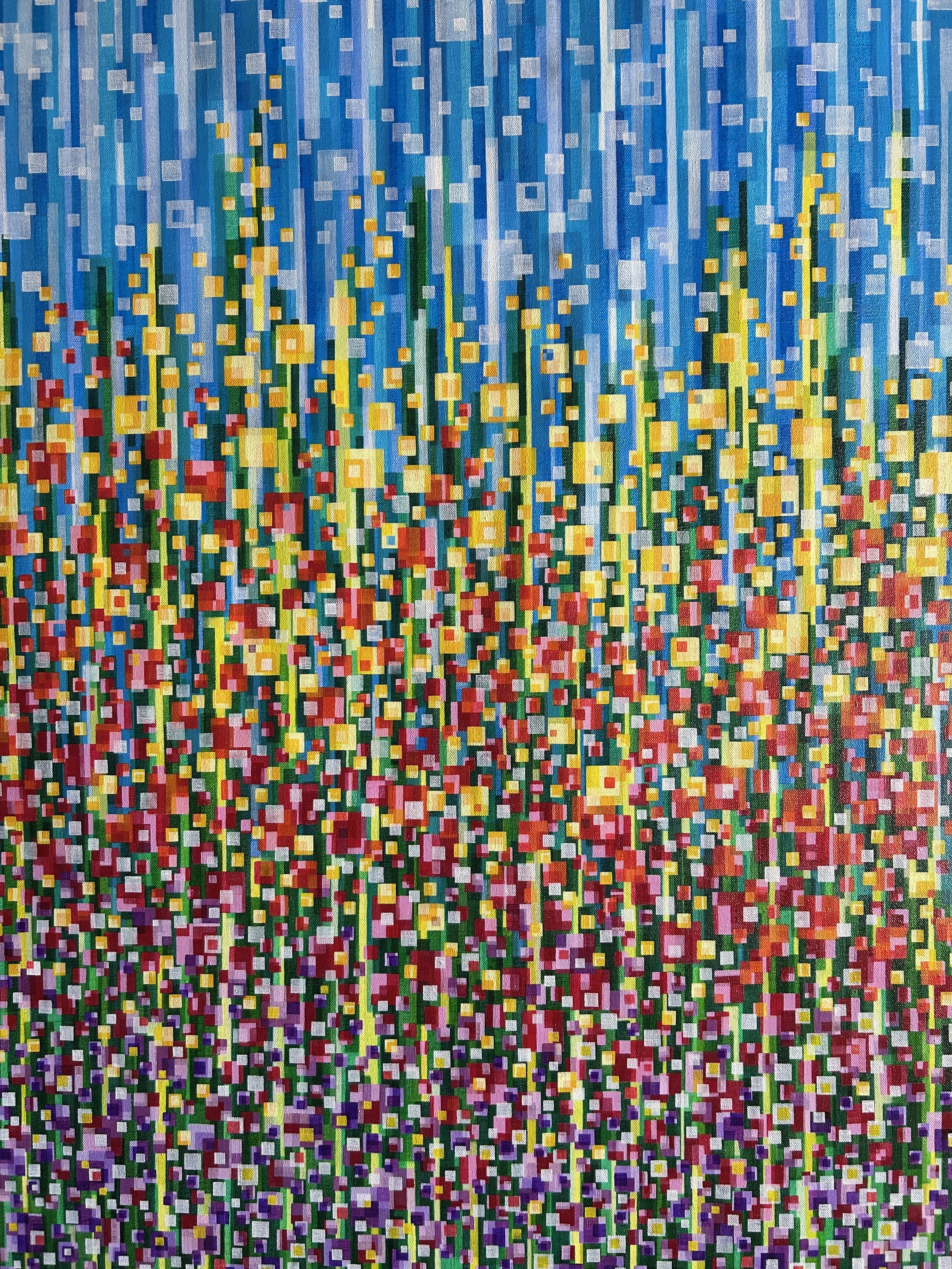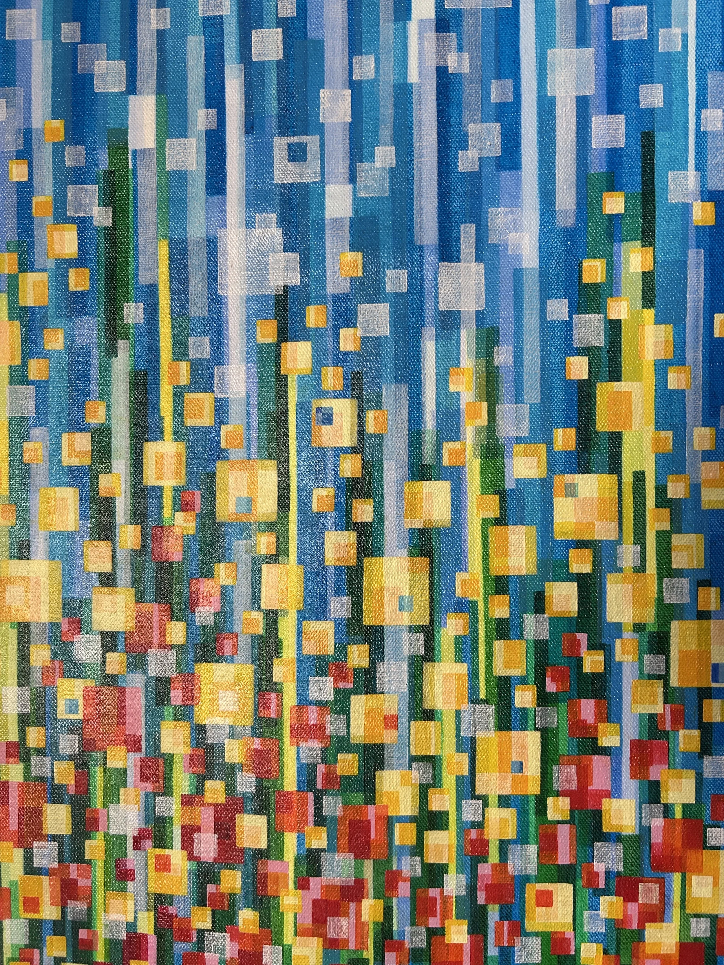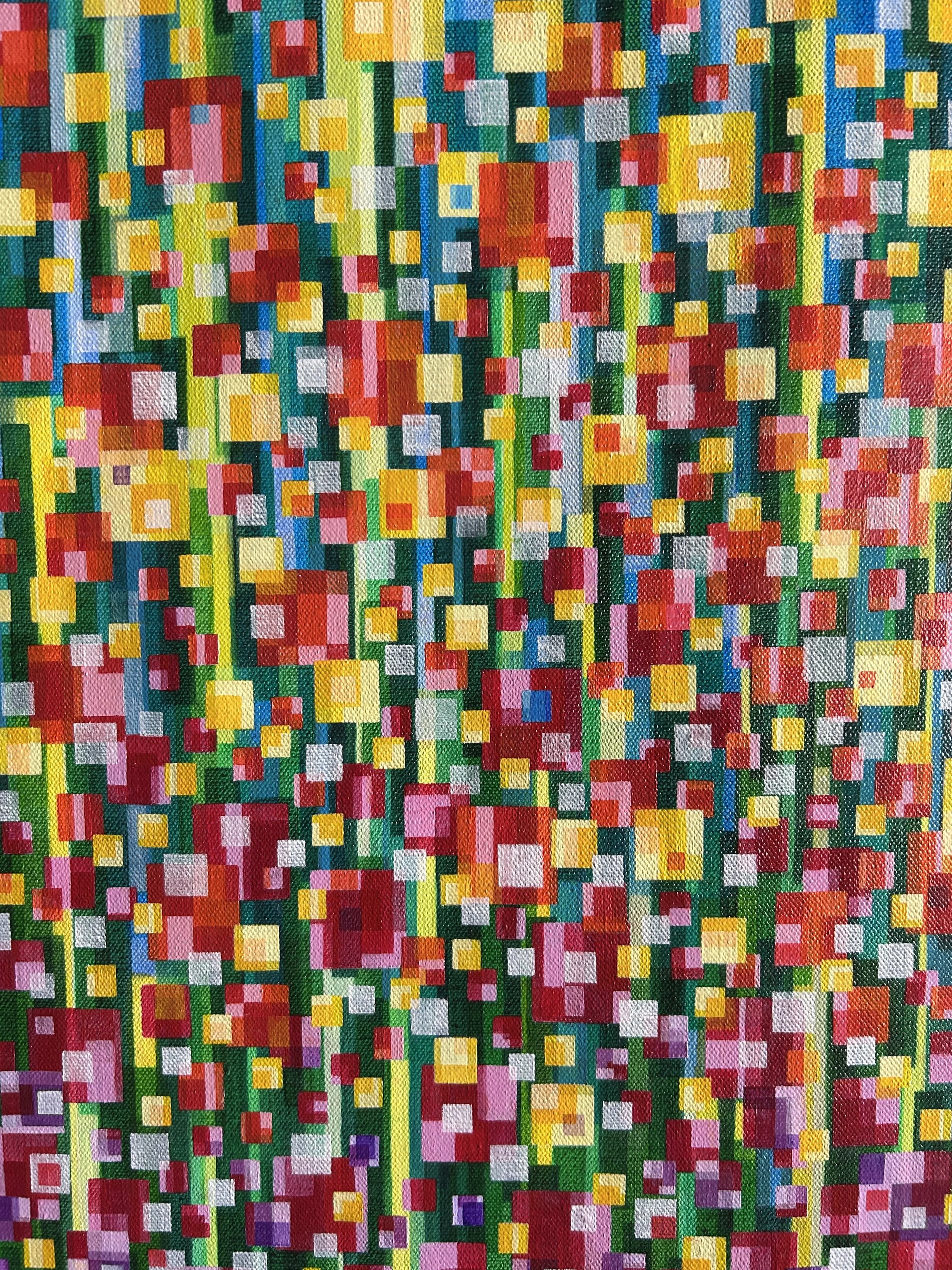 I could see his point. As I explained to him, what I saw with my eyes and in my mind was a mess. A wild mess of colors and species along with the sky and other elements. I was not interested in producing a painting of flowers, a still life or landscape. I wished to create an abstraction of grids and color. A metaphor for humanity. We are the wild mess – colorful and diverse – easily trampled and disregarded.