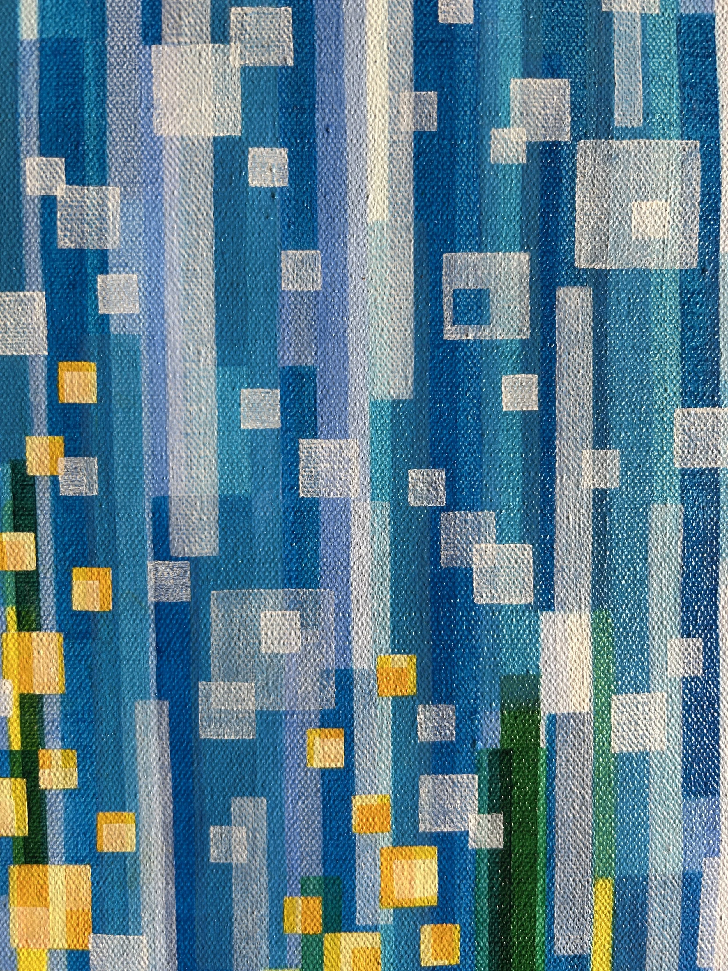 I decided to give this painting the title, “FALLOUT,” which seemed appropriate. I started it in 2021, while sheltering from COVID19 and dealing with the FALLOUT from The Insurrection of January 6. At the time it seemed like an antidote to the bleakness I felt was consuming everything. I wanted to use vertical lines to somehow express opposition. Many of my previous paintings flowed in a horizontal direction. When I spoke of those paintings I used words like pulsing, flowing, running, chasing, free. This painting was more about gravity – things falling downward. Back to earth. And it is about rising – in this case the plants and grasses that rise from the earth as the falling rain nourishes them. The bursting upwards of color and amazing diversity that feeds the eyes and soul. I needed something hopeful.